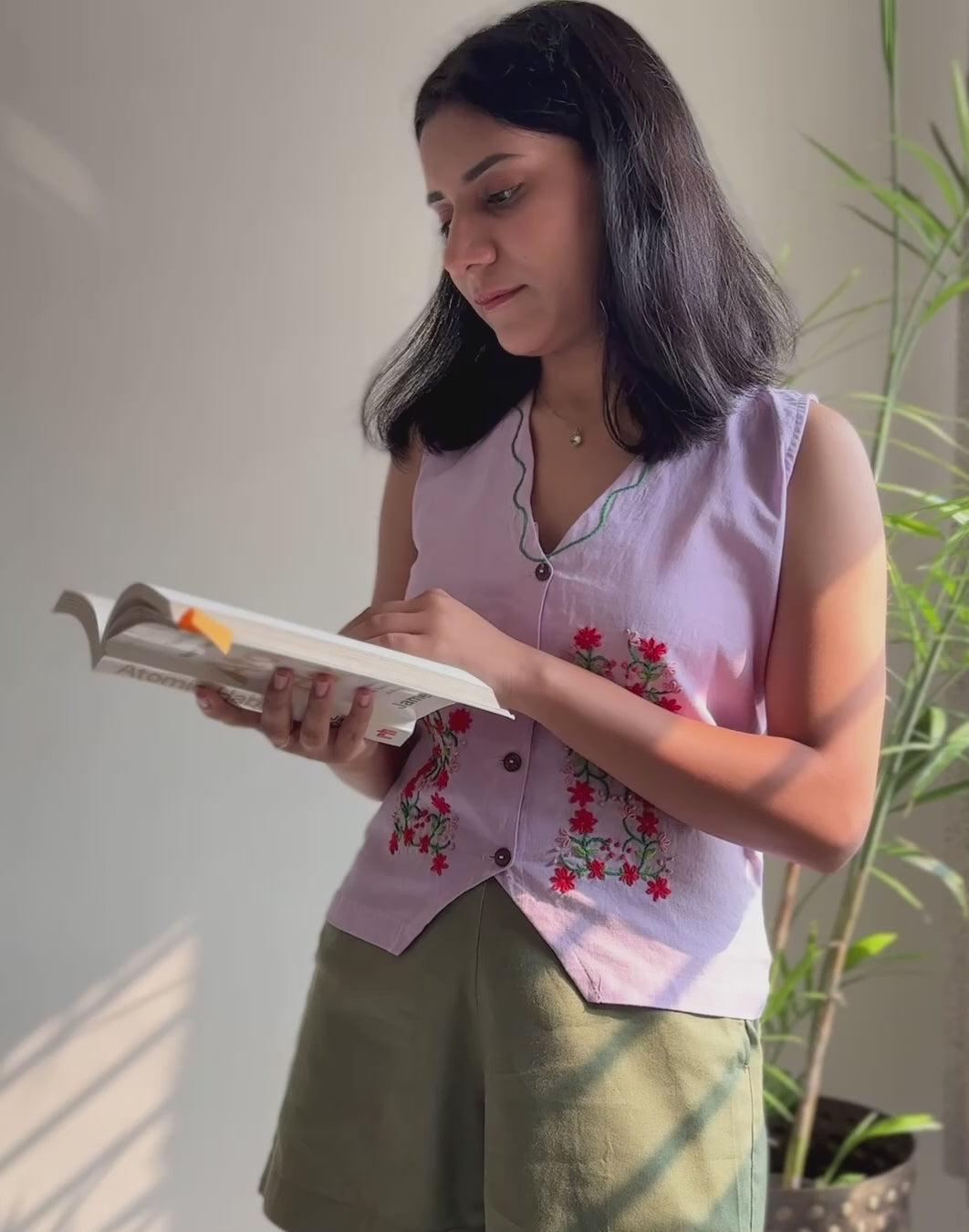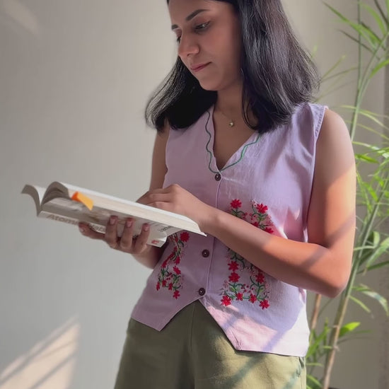 Elevate your summer wardrobe with our Lilac Bloom Hand-Embroidered Vest, where comfort meets craft. Made in soft, breathable cotton linen, this sleeveless top features intricate floral embroidery in vibrant reds and greens, thoughtfully placed for a balanced, eye-catching design. The detailed neckline adds a delicate touch, while the wooden buttons complete its earthy charm.